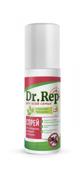Спрей Dr. Rep для надежной защиты от укусов кровососущих насекомых (комаров, мокрецов, москитов, мошек, слепней и блох). Для нанесения на открытие части тела и одежду. Время защитного действия при нанесении на кожу - до 4-х часов, на одежду - до 20 суток. Не раздражает кожу. Не оставляет пятен на одежде. Содержит масло мяты.